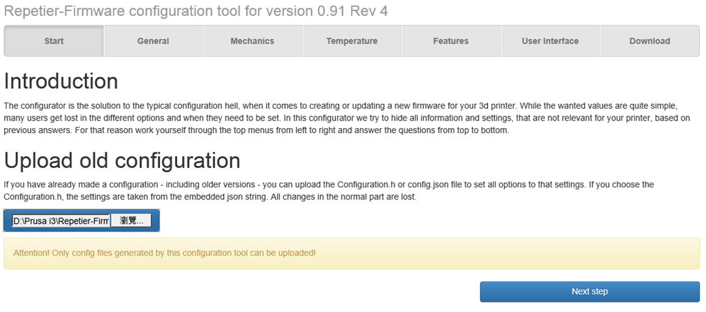 我下載了Repetier firmware,並且很簡單地經由Arduino IDE編譯成功,這至少代表它提供的原始韌體檔可以沒有錯誤地編譯,先別急著上傳至控制板,對了我們要修改Configuration.H檔案,很多人(尤其沒有C語言背景的)聽到這個就頭大,不過好消息來了,Repetier提供了網上(web based)自動修改並產生Configuration.H設定檔的工具(configuration tool),以下就是這個過程: